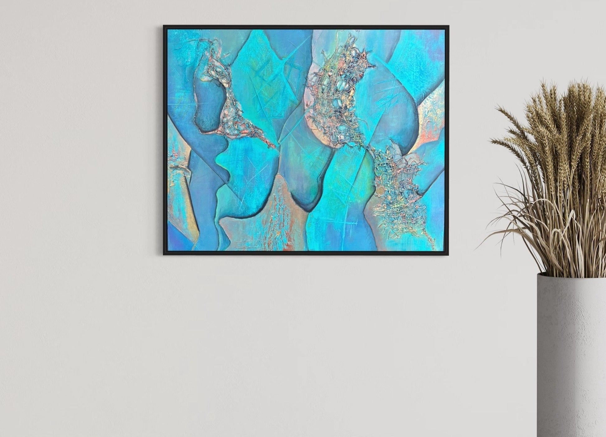"Touché" fesselt das Auge mit seinen abstrakten Formen, deren Zusammenspiel ein wunderschönes Chaos bildet, das ein Gefühl von kontinuierlicher Bewegung und dynamischer Energie hervorruft. Die lebendige Darstellung lädt jeden Betrachter zu einer einzigartigen, emotionalen Reaktion ein und beweist, dass in der abstrakten Kunst die Interpretation des Betrachters ebenso wichtig ist wie die Absicht des Künstlers.